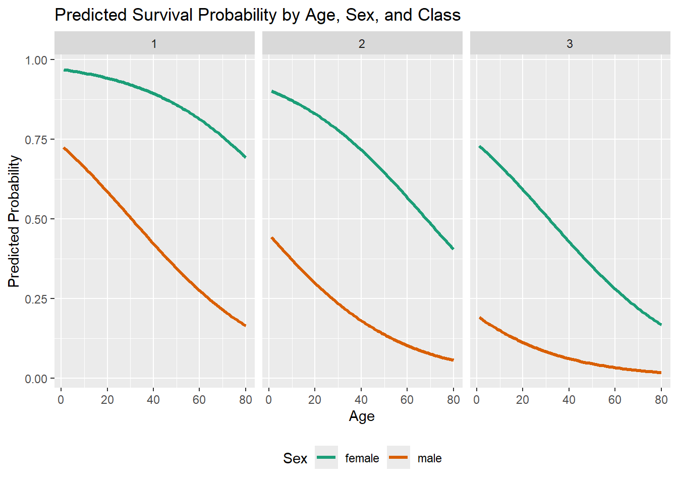 The study evaluates the influence of passenger class, gender, and age on survival probabilities. Results indicate that survival was strongly associated with gender and class: women and first-class passengers had substantially higher survival rates, while men and third-class passengers faced markedly lower odds. Age also played a significant role, with survival probability decreasing steadily as age increased. The logistic regression model quantifies these relationships, providing a clear statistical framework for understanding the factors that shaped survival on the Titanic.